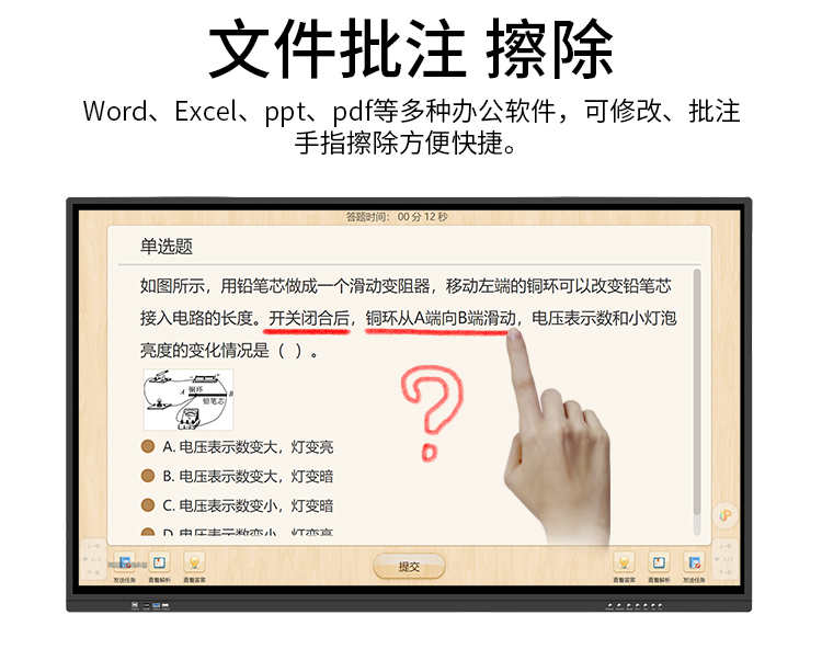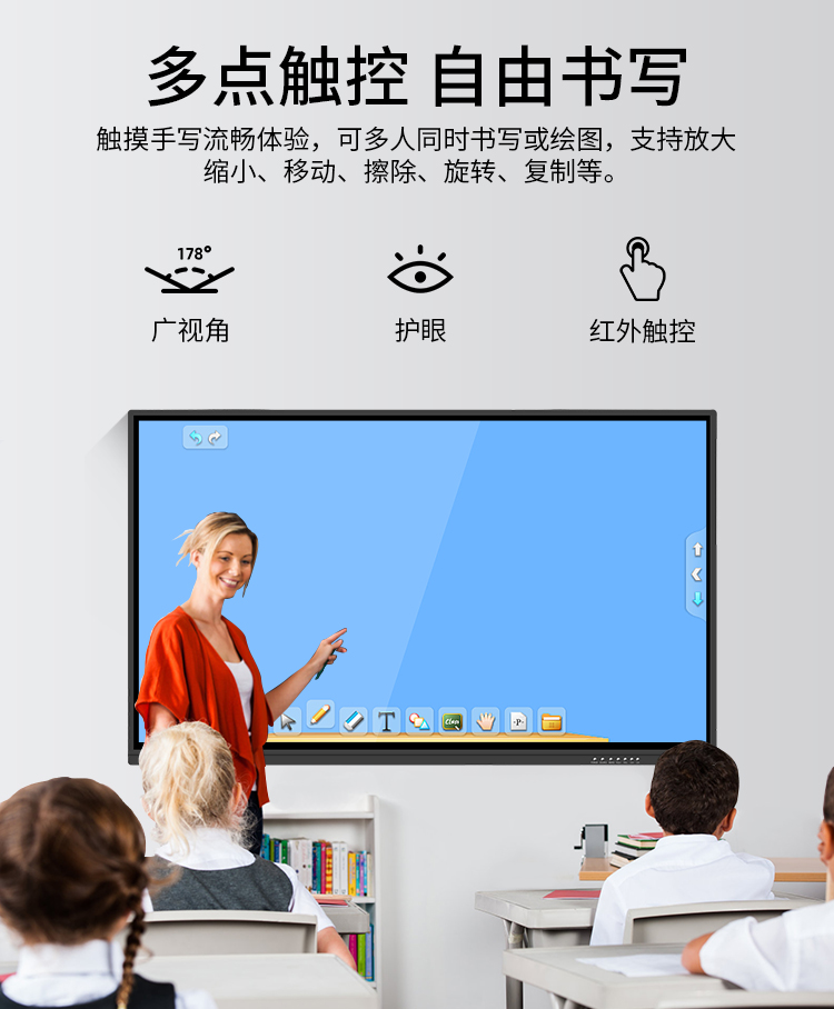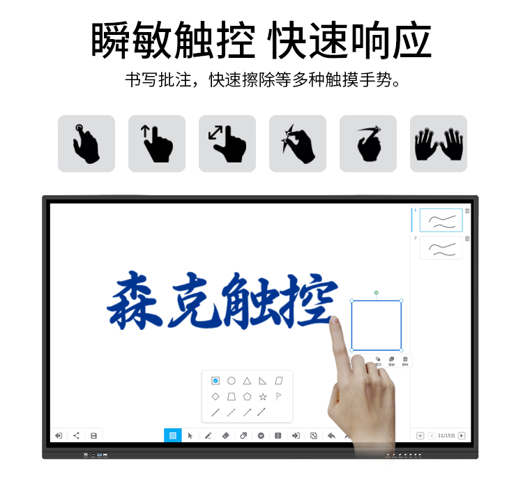 【產(chǎn)品簡(jiǎn)介】支持 10 個(gè)人同時(shí)書(shū)寫(xiě),學(xué)生們一起上臺(tái)書(shū)寫(xiě)答題、共同手繪一幅畫(huà),無(wú)限的協(xié)作空間,源于森克先進(jìn)的觸控技術(shù),高靈敏、高精準(zhǔn)觸控,媲美鋼筆書(shū)寫(xiě),多人書(shū)寫(xiě)相互 0 干擾。
